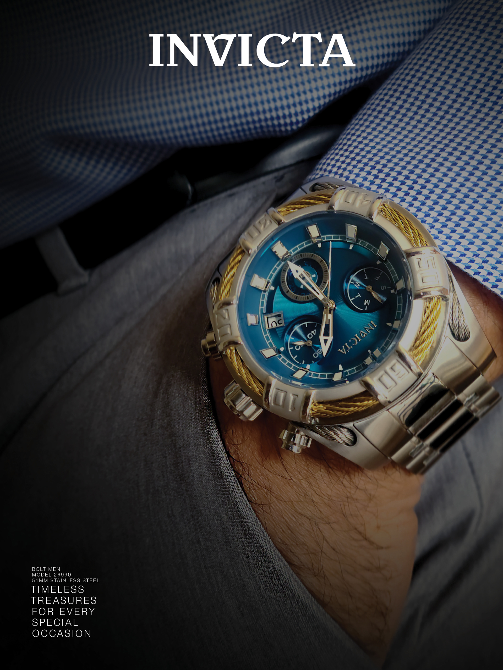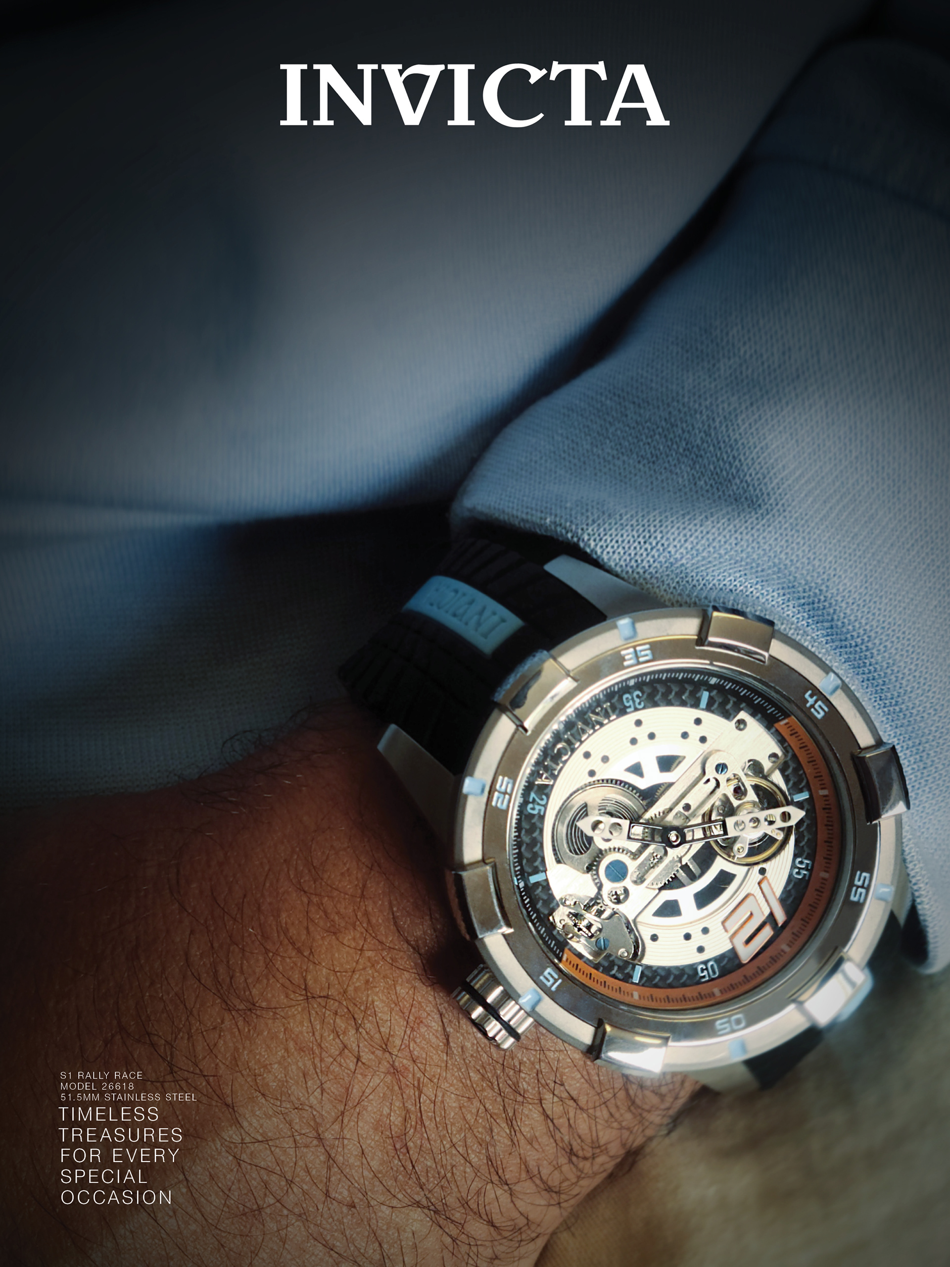 This project introduced a challenge: capturing original photographs of a chosen subject and developing a three-part ad poster series. For this, I selected the brand Invicta, renowned for its legacy in watchmaking since its establishment in Switzerland in 1837. I chose my father as a model, I curated a series of photographs featuring various Invicta timepieces, paired with diverse clothing styles. This deliberate approach aimed to underscore Invicta's versatility, demonstrating that their treasured watches seamlessly complement every occasion and attire.